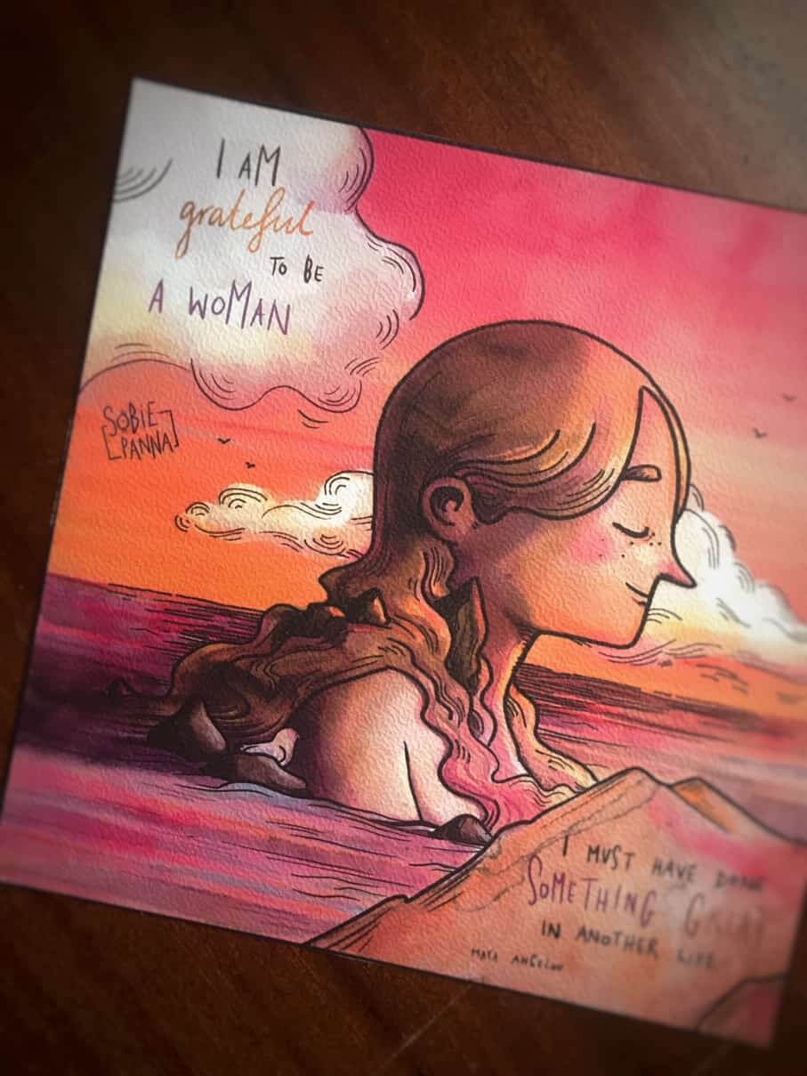 Wydruk obrazu „Wonder Woman”- wspomnienie uczucia doświadczania na ciele ciepłego zachodu słońca ilustrującym piękne słowa Mayi Angelou które warto sobie przypominać.